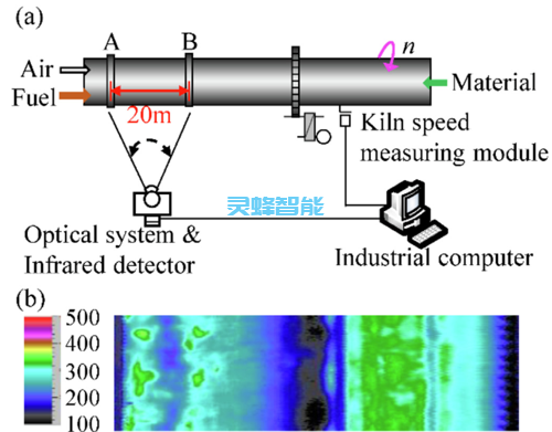 壳温度过高可能会造成无法弥补的损害,因此,大多数中国水泥公司已采用红外热像仪技术对煅烧区的壳温度进行连续扫描,以对回转窑测温。红外热像仪系统由四个主要部分组成:光学系统,红外检测器,窑速测量??楹凸ひ导扑慊?。每行扫描使用光学系统收集来自窑壳的红外辐射,然后将其反射到红外检测器。红外辐射能量被转换为电信号并传输到工业计算机,在工业计算机中,该信号被转换为温度值并可视化为红外图像。随着窑炉在其轴线上的连续旋转,圆柱形窑炉壳体的表面被连续扫描。窑速测量??榭扇繁O低车纳杷俣扔胍に俦3滞?,即在窑旋转一圈后,即可对煅烧区窑壳的整个表面进行扫描。为了确保红外图像的可靠性,红外热像仪在安装过程中进行了调试和校准。